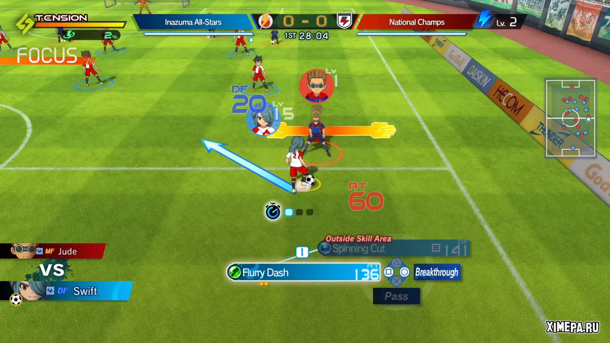 Главная кампания разворачивается как полноценное JRPG-приключение: сюжетные эпизоды развиваются через последовательные «поединки» в стиле ATB и мини-испытания, которые помогают тренировать персонажей. Эти элементы создают ощущение путешествия, где каждая победа — шаг к становлению героя и его команды. Но настоящая энергия игры раскрывается на поле: динамичные матчи 5 на 5 и 11 на 11 наполнены узнаваемой стилистикой Inazuma Eleven, эффектными приёмами и простым, но захватывающим управлением. Система развития футболистов позволяет собирать собственную команду мечты и экспериментировать со стилями игры.