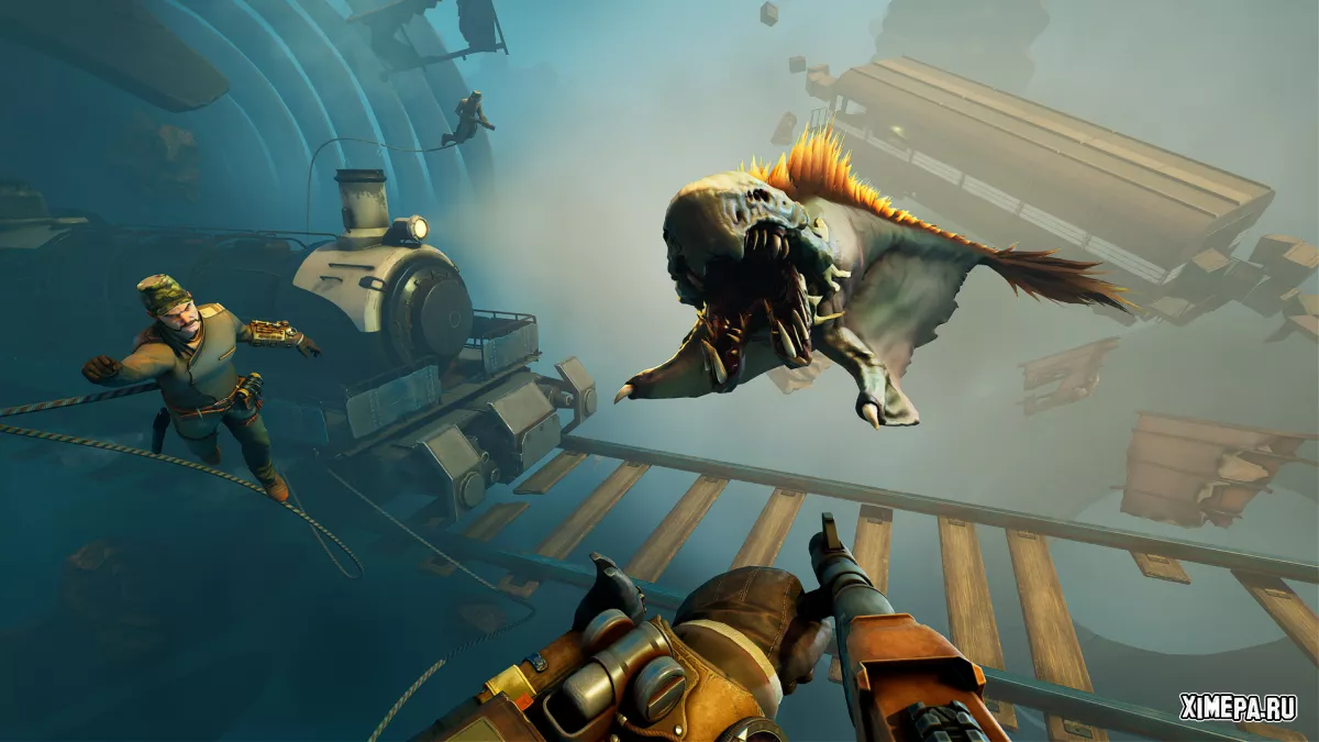 Даже второстепенные механики усложнены без необходимости. Ускорение поезда превращено в странную мини-игру, которая, по сути, ничем не управляет. Использование лебёдки требует заранее изготовленных кольцевых креплений, которые нужно метать в парящие камни, а при нехватке материалов приходится возвращаться к поезду и заниматься крафтом снова и снова. Попутно всплывают технические недочёты: дрожащие руки героя мешают прицеливанию, ресурсы из открытых контейнеров разлетаются в недоступные места, а текст на экране настолько мелкий, что его трудно читать на нормальной дистанции.