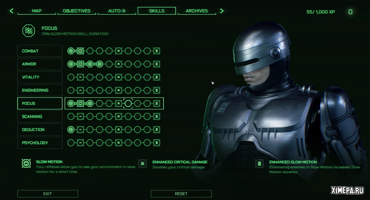 - Мощный Auto-9 и другие 20 видов оружия помогут вам разобраться с преступниками на всех этапах этого захватывающего приключения. Робототехника и кибернетика наградили вас силой и навыками, которые можно улучшать по мере прохождения игры. Вряд ли еще найдется хоть один полицейский, который сможет бороться с преступностью эффективнее вас.
