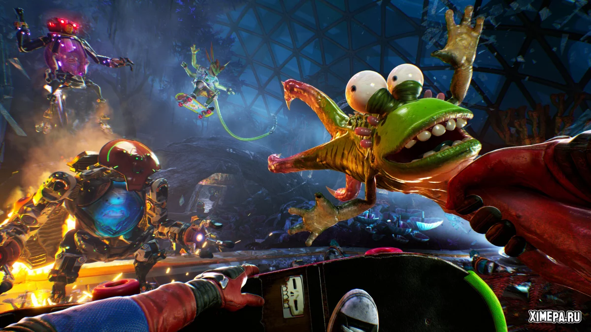 Главное нововведение — скейтборд, который герой получает в самом начале и использует на протяжении всей игры. Он позволяет скользить по рельсам, ехать по стенам, совершать длинные прыжки и быстро перемещаться по локациям, поэтому исследование и платформинг стали гораздо динамичнее. Многие столкновения даже рассчитаны на постоянное движение: игроку приходится стрелять на ходу, перепрыгивая между элементами окружения. Это делает перемещение зрелищным и необычным, но одновременно усиливает беспорядочность боёв, превращая их в непрерывный поток движения, выстрелов и визуального шума. В итоге геймплей ощущается более быстрым и акробатичным, но менее аккуратным и читабельным, чем в оригинале High on Life.