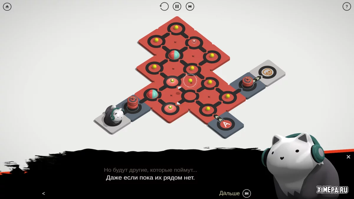 В Cadence сюжет предельно минималистичен и подан скорее как мягкая рамка для медитативного игрового процесса. Игроку предстоит разбудить кота по имени Рен, создавая аккуратные мелодии из отдельных музыкальных блоков-элементов. Каждая решённая головоломка превращается в короткую музыкальную фразу, и именно эти «мелодии-схемы» постепенно выводят Рена из сна. После прохождения уровней кот иногда делится философскими размышлениями о жизни, но эти реплики можно пропускать, если хочется сосредоточиться только на задачах и звуке.
