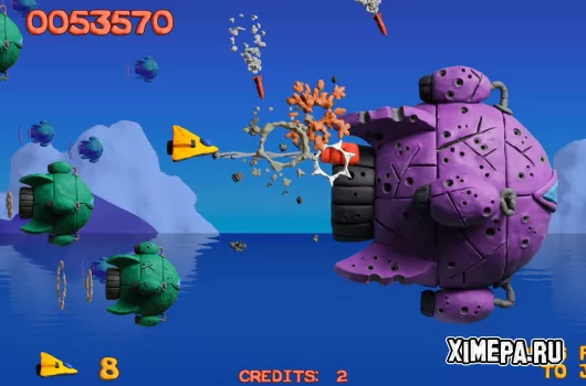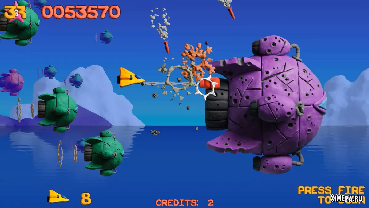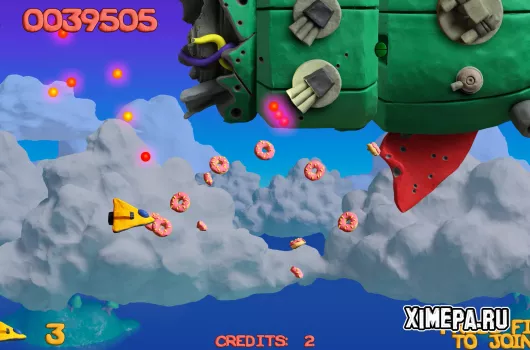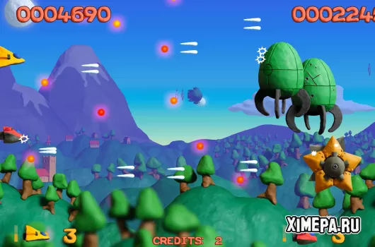 Игровой процесс же остаётся классическим для жанра: горизонтальный скролл, волны противников, несколько зон в каждом уровне и обязательные сражения с боссами. Управление привычное, динамика быстрая, а механики хорошо знакомы поклонникам аркадных шутеров. В то же время система получения оружия вызывает противоречия. С одной стороны, здесь есть забавные и необычные пушки вроде стрельбы пончиками или рыбой, что отлично вписывается в атмосферу. С другой — сама механика выбора вооружения через «стрельбу по звезде», меняющейся на разные варианты, может раздражать, особенно в условиях напряжённого боя, когда важно не отвлекаться. К тому же оружие действует лишь ограниченное время, а не до потери жизни, что ещё больше снижает ощущение контроля.