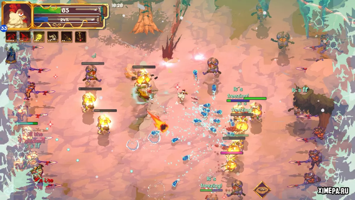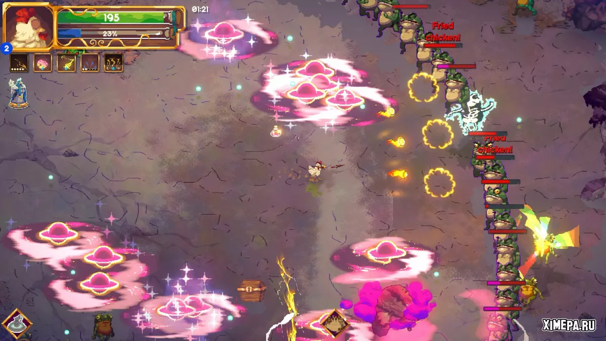 Представь себе мир, где курица — это не просто курица, а воплощение хаоса и магии, несущая на своих крыльях разрушение и абсурд. Здесь ты создаёшь свою собственную волшебную палочку, превращаешь её в инструмент хаоса и выстраиваешь уникальный билд, чтобы стать настоящим кошмаром для орд жутких, вечно голодных лягушек. Каждое сражение — это танец безумия, где бесчисленные комбинации магии переплетаются в такие взрывоопасные комбо, что сама реальность дрожит от напряжения.