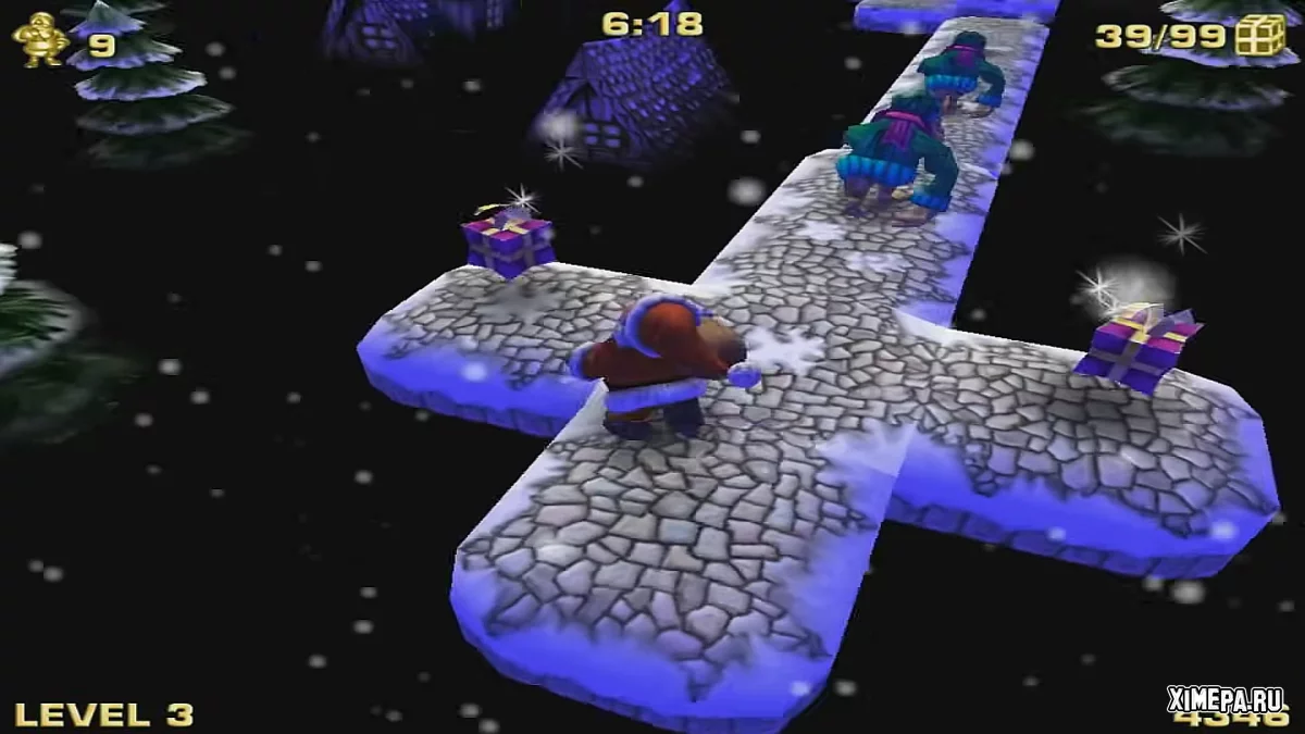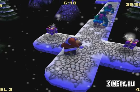 Santa Claus in Trouble... again!: Продолжение увлекательной аркады про похождения Санты... И опять празднование Рождества под угрозой! Идея почти не изменилась. Задача игрока — собрать кучу подарочных коробок, преодолевая хитроумные уровни, населенные враждебными аборигенами. Гостинцы делятся на три категории: простые, поярче и роскошные. Первыми локации буквально кишат (по 60), вторых — по 30, а самые заветные в количестве 10 штук спрятаны в наиболее труднодоступных местах. Разумеется, наш герой, как ему и положено по рангу, законченный пацифист и друг зверушек. О том, чтобы разогнать живность пинками, нет и речи. Дедушка должен проявить чудеса ловкости, дабы пробраться мимо врагов. При этом разрешено использовать только бег, прыжок и… двойной прыжок.