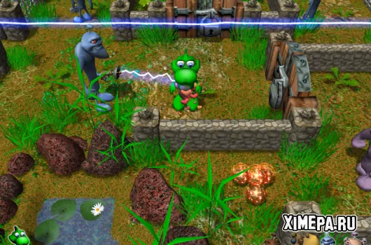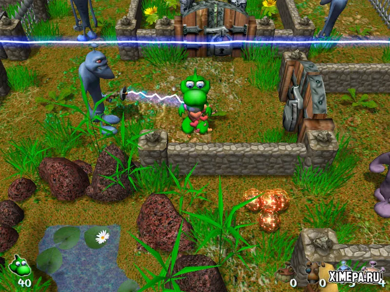 «Dino and Aliens» — это трёхмерная аркадно-головоломная игра, где в центре событий оказывается забавный динозавр с огромными глазами, вынужденный сражаться с инопланетными захватчиками. Игровой процесс сочетает элементы классического «Bomberman» и атмосферу «Chip's Challenge»: маленькие лабиринтообразные уровни наполнены врагами и ловушками, включая смертоносные лазерные лучи и взрывоопасные ящики. Чтобы пробираться вперёд, динозавр использует бомбы разных типов, которые помогают уничтожать пришельцев и прокладывать новые пути. Несмотря на простоту головоломок и иногда несколько неуклюжее управление, игра выделяется яркой музыкой, приятной трёхмерной графикой и интуитивными задачами. В итоге она создаёт лёгкое и весёлое приключение, рассчитанное в первую очередь на младшую аудиторию.