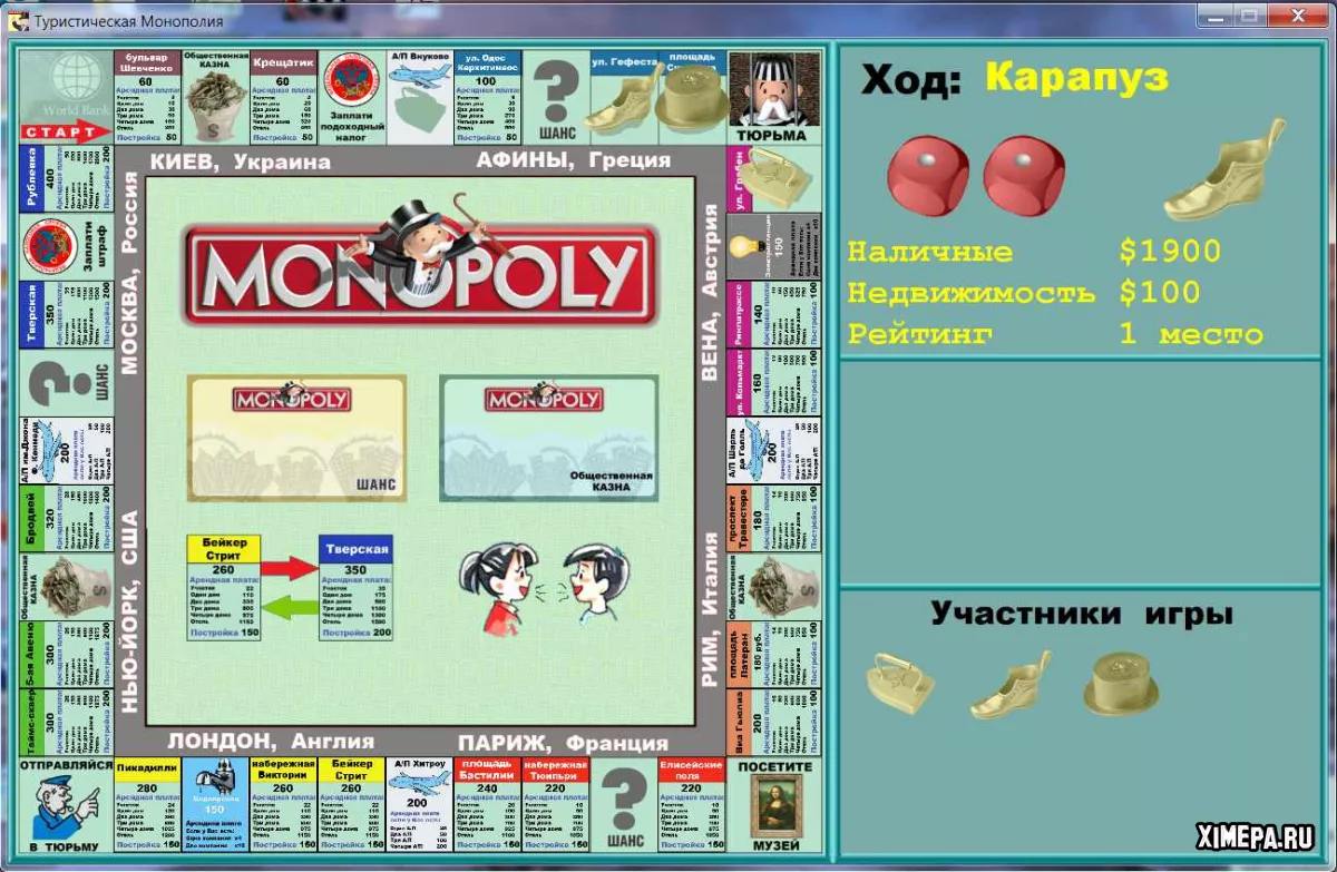 Вторая игра - "Туристическая Монополия". На игровом поле карточки 22 участков (улиц и площадей) 8 мировых столиц туризма. Нужно скупать участки и становиться монополистом в городе, после чего на этих участках можно строить дома и отели. Основной транспорт - авиация, поэтому плохая погода может отправить Вас в другой город. Отдохнуть можно в Музее, рассматривая картины известных художников.