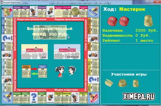 Вашему вниманию предлагаются три игры, представляющие собой развитие знаменитой МОНОПОЛИИ. Первая игра - "Русская Монополия". На игровом поле карточки 24 компаний, разбитых на 8 отраслей промышленности. Игроки бросают кубики, передвигают фишки, скупают предприятия, застраивают их филиалами и предприятиями. Цель игры - разорить противников. На ход игры существенно влияют события, происходящие при открывании карточек ШАНС и ПЕРЕМЕЩЕНИЕ. Они максимально приближены к тем событиям, которые происходят в окружающем нас мире.