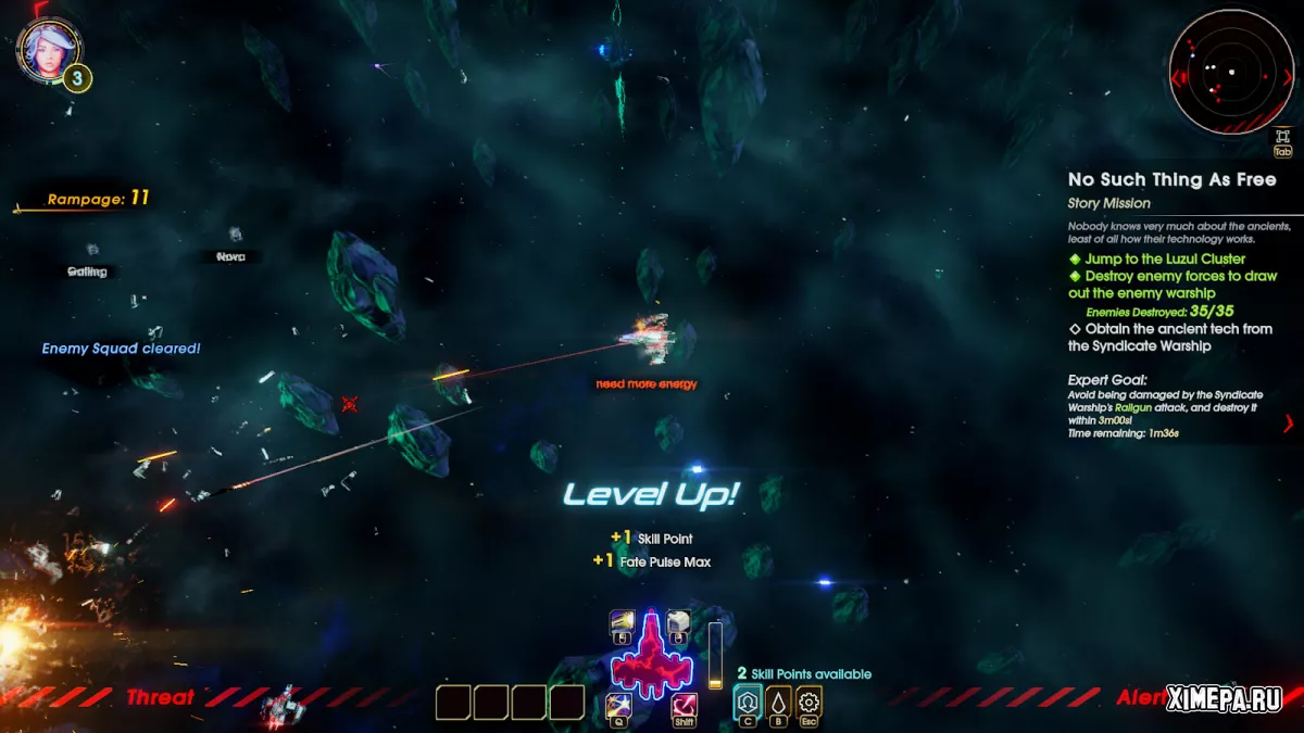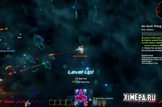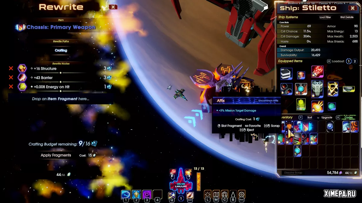 Игровой процесс построен вокруг привычной схемы топ-даун космического шутера с миссиями, добычей ресурсов и улучшением снаряжения. Всё меняется в тот момент, когда в ход вступает механика Rewrite: можно усиливать оружие, усложнять миссии ради лучших наград, переписывать диалоги, избегать плохих концовок и даже активировать сверхспособности вроде замедления времени или выпуска гигантского лазера. Особая изюминка — в том, что смерть персонажа не становится окончательной. Игрок может «сломать» линию судьбы и начать новый цикл, потеряв добычу и уровни, но заработав специальные очки, открывающие бонусы для будущих прохождений. Каждый новый виток истории приносит неожиданные изменения и не даёт игре наскучить, превращая каждую смерть скорее в повод вернуться и попробовать снова.