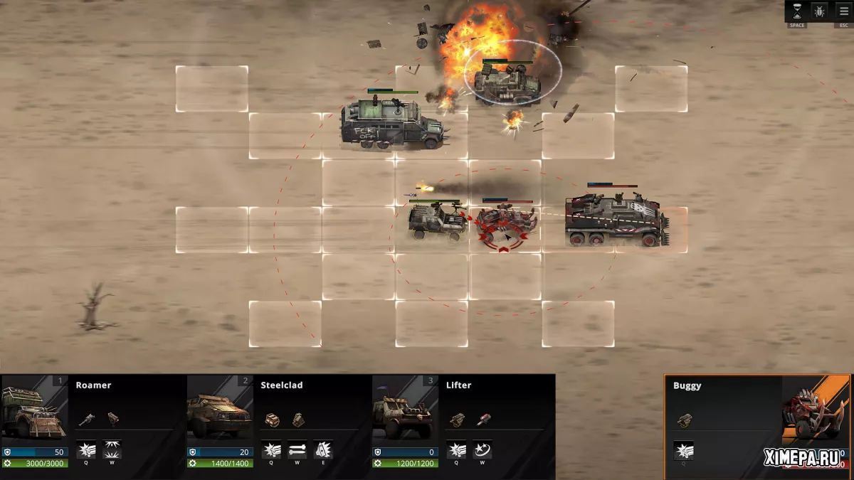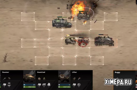 Сражения в Dust Raiders проходят на сетке, где техника двигается по клеткам, а игрок управляет боем в режиме замедления времени. Это даёт возможность заранее отдавать приказы, продумывая расстановку и использование умений. У каждого автомобиля есть свои особенности: например, в демо главная машина могла таранить врагов, отбрасывая их в препятствия и нанося серьёзный урон. Подобные элементы добавляют глубину и заставляют обращать внимание на окружение и тайминг.