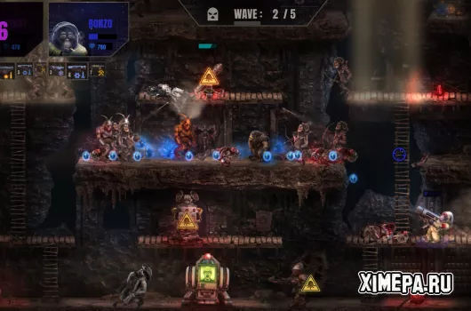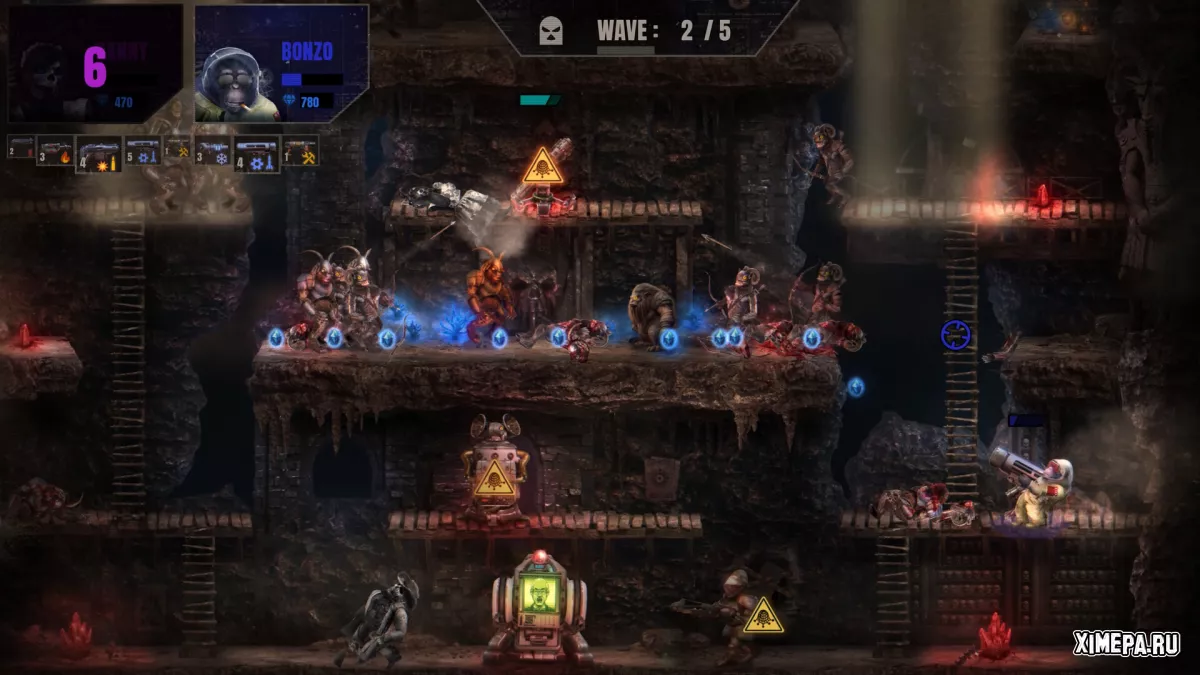 Играть можно как в одиночку, так и вдвоём на одном устройстве — в кооперативном режиме, где союзники помогают друг другу открывать новые технологии и более эффективно отражать атаки врагов. Процедурная генерация уровней и разнообразие режимов делают каждую сессию уникальной, а развитие базы и сражения с различными типами противников и боссов добавляют глубину и азарт в каждую битву.