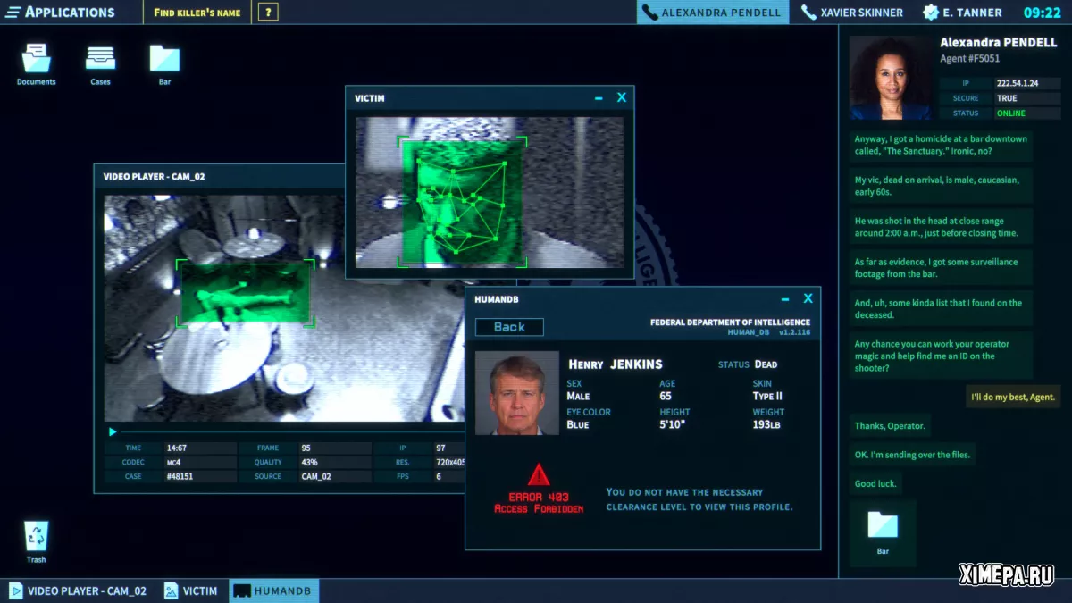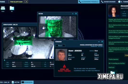 The Operator — это короткий, но увлекательный кибертриллер от Bureau 81, в котором игроку достаётся роль “человека за компьютером”, офисного сотрудника по имени Эван Таннер. Он работает на вымышленное Федеральное разведывательное управление (нечто среднее между ФБР и ЦРУ), и проводит расследования, не покидая своего рабочего места. Всё происходит через реалистично выглядящий интерфейс компьютерного терминала: ты анализируешь видео, изучаешь базы данных, проверяешь улики и поддерживаешь связь с агентами в поле. Атмосфера напоминает телевизионные криминальные сериалы, включая характерный голосовой актинг, и в целом игра подаётся как интерактивный фильм от первого лица — ты всегда смотришь на экран Эвана.