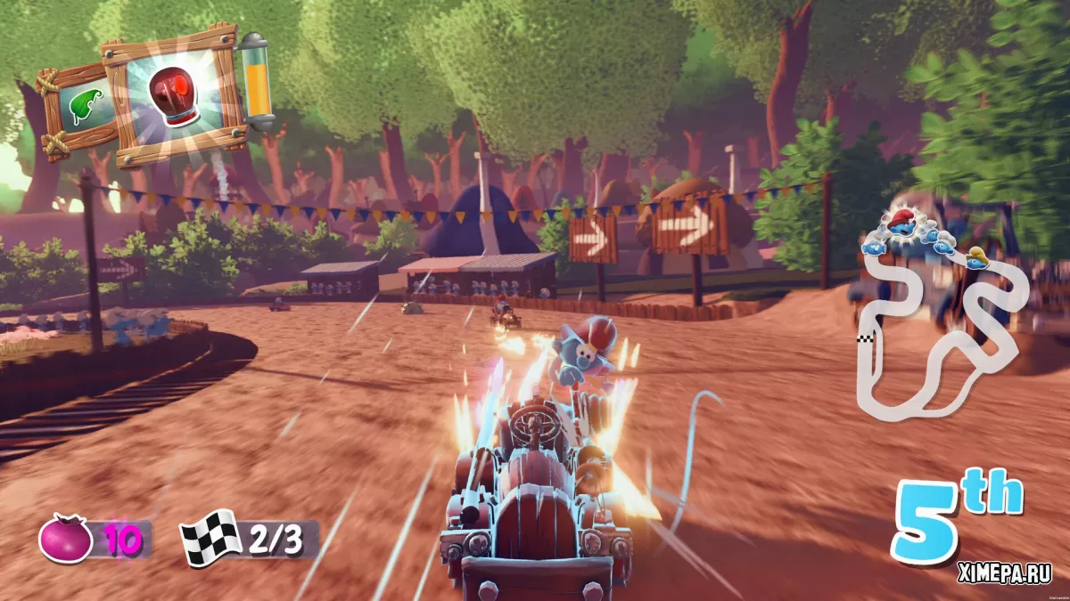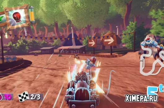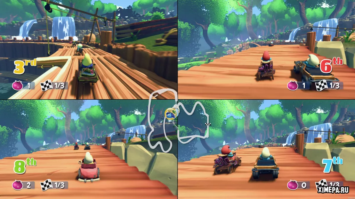 Управление простое и понятное, с возможностью дрифтовать для ускорения. Даже новичкам будет легко освоиться: есть вспомогательные функции вроде автоповорота и автоускорения — удобно для младших игроков. Визуально игра приятная, хоть и сдержанная в палитре — как ни странно, для мультяшной игры здесь мало ярких цветов, за исключением самих Смурфов. Частота кадров стабильная и даже на сплит-скрине работает плавно.