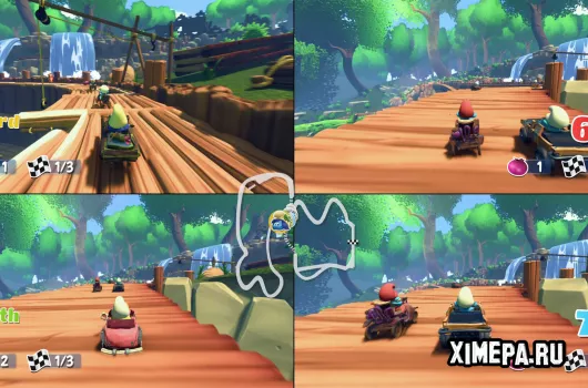 Трассы оформлены в стиле классических кубков, некоторые идут в обратном направлении, что добавляет разнообразия. Однако в начале они кажутся однотипными — много коричнево-серых оттенков и плохо заметные указатели направления. Со временем трассы раскрываются, но первое впечатление может быть скучным. В одиночном режиме есть стандартные заезды, но режимов немного. Мультиплеер — только локальный, максимум на четырёх игроков, без онлайна, что сильно ограничивает интерес к игре в долгосрочной перспективе.