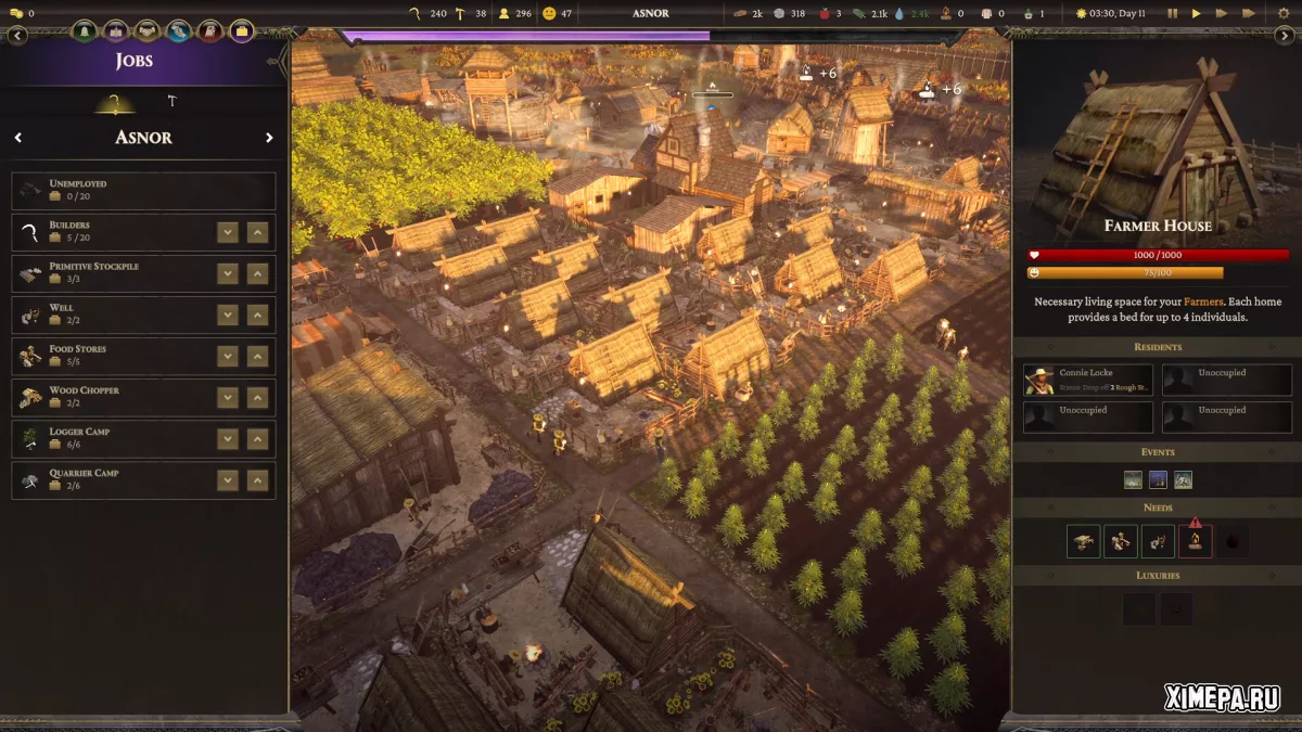 Геймплей начинается с выбора одной из провинций, где вы разворачиваете караван и закладываете первую крепость — центр будущего поселения. Постепенно выстраиваются дома, производственные здания, склады и фермы. Все строения требуют работников, и управление трудовыми ресурсами — ключевая задача игрока. Важную роль играют уровни счастья и потребности жителей, от которых зависят налоги, рост населения и стабильность. При недовольстве возможны мятежи и эпидемии.