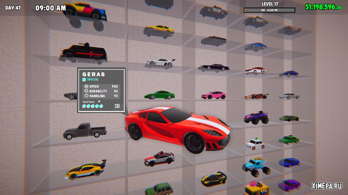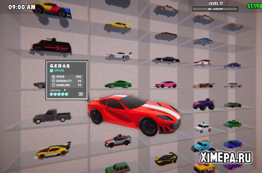 Кроме того, каждый автомобиль можно не только хранить или продавать, но и выпускать на миниатюрную трассу прямо в магазине. Гонки проходят с использованием специальных карточек навыков, которые добавляют элементы стратегии: ловушки, ускорения, блокировки. Игрок может сам участвовать в заездах или сдавать трассу клиентам за плату. Это оживляет магазин и приносит дополнительный доход.