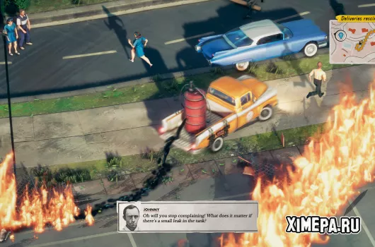 Deliver At All Costs — это безумный симулятор доставки, в котором процесс больше похож на вождение в состоянии алкогольного опьянения, чем на вдумчивые прогулки из Death Stranding. Вместо сложного управления весом и аккуратного передвижения по холмам, игра предлагает нестись на пикапе по улицам условной Америки 50-х годов, сметая всё на своём пути: заборы, витрины, дорожные знаки и случайных прохожих. Каждый новый груз всё нелепее, а каждое задание всё больше напоминает цирк на колёсах, где главное — не доставить, а устроить разрушительный хаос.