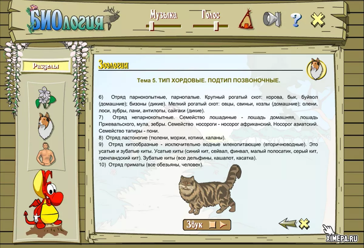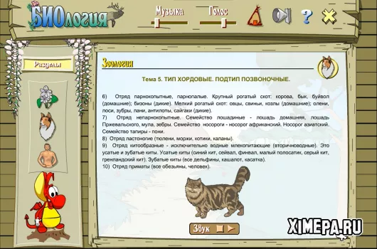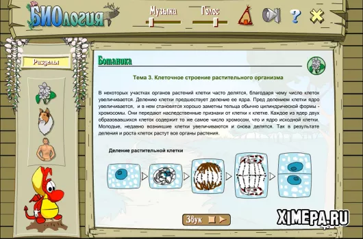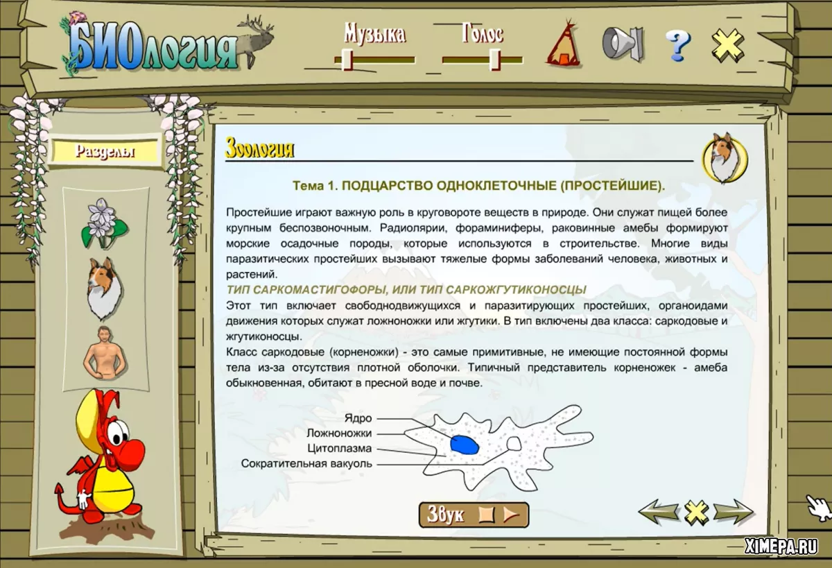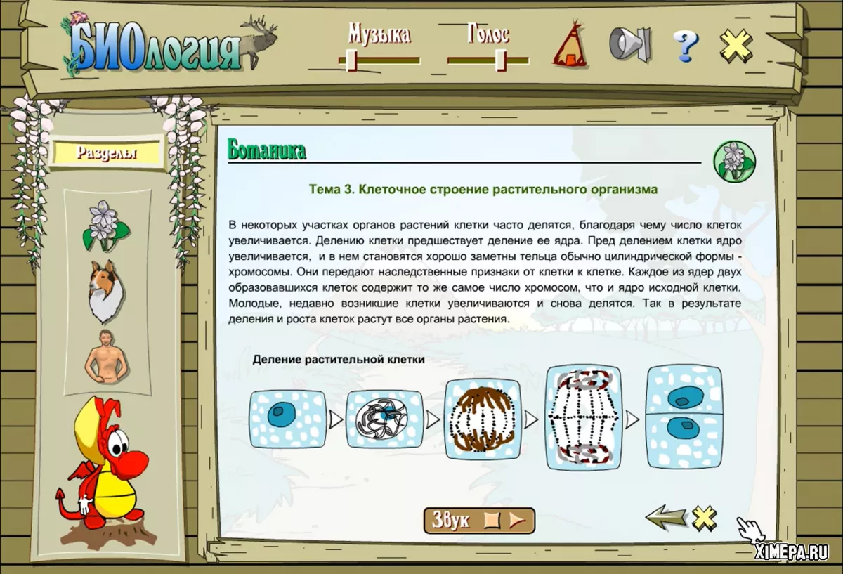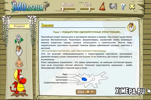 “Дракоша и занимательная биология” – одна из ранних частей в огромной серии образовательных игр от российской фирмы G.O.G. Games. Как и большинство остальных, эта состоит из трёх разделов, в которых есть по несколько тем с теорией и тестом в каждой. А к некоторым прилагаются ещё и мини-игры.