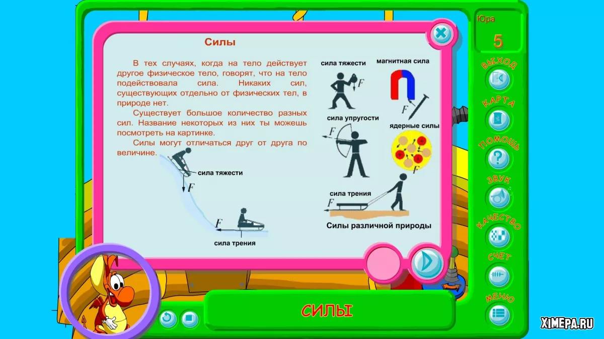 Чтобы усвоить полученные знания, предусмотрены интерактивные тесты и задания, которые позволяют проверить свою эрудицию. А самые любознательные смогут не только учиться, но и играть! Каждая мини-игра в разделе несёт в себе не только развлечение, но и познавательный элемент. Чем больше правильных ответов и успешных экспериментов — тем выше ваш результат и больше очков в копилке достижений!