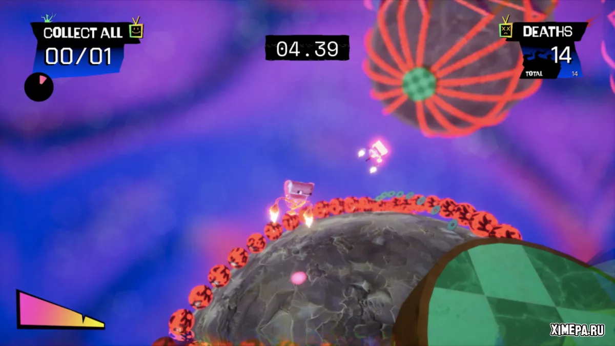 Платформенные этапы выполнены в духе Super Mario Galaxy: гравитация здесь меняется, и приходится бегать по поверхностям под разными углами, собирать кассеты и телевизоры, а также решать лёгкие головоломки. Сложность постепенно возрастает, появляются новые механики вроде реактивного ранца с рывком в воздухе, а сами уровни можно перепроходить в аркадном режиме, чтобы улучшать результаты. Однако камера иногда подводит и усложняет задачу сильнее, чем сами препятствия.