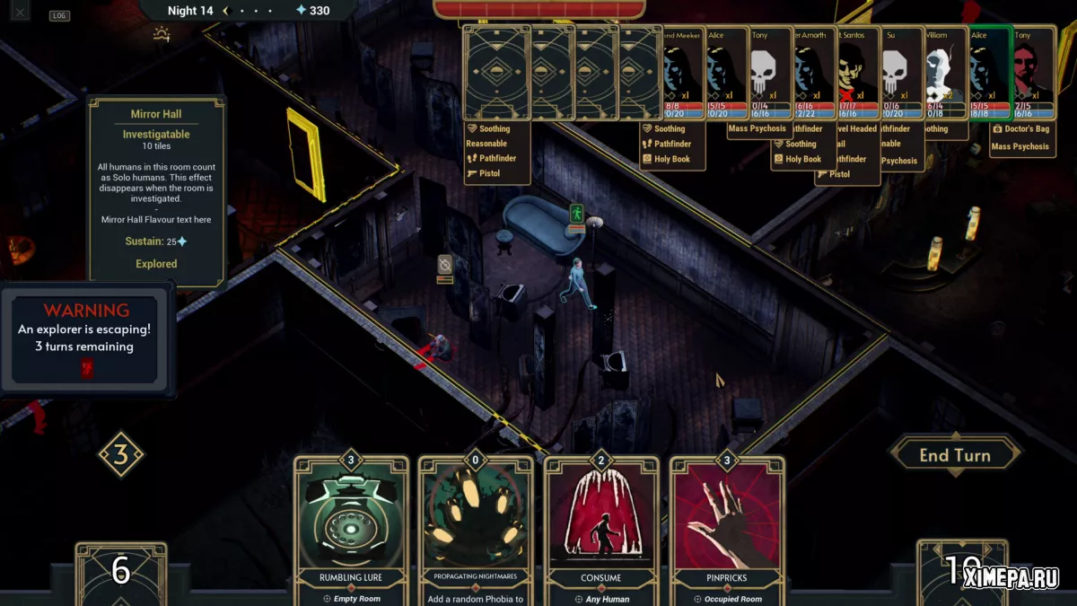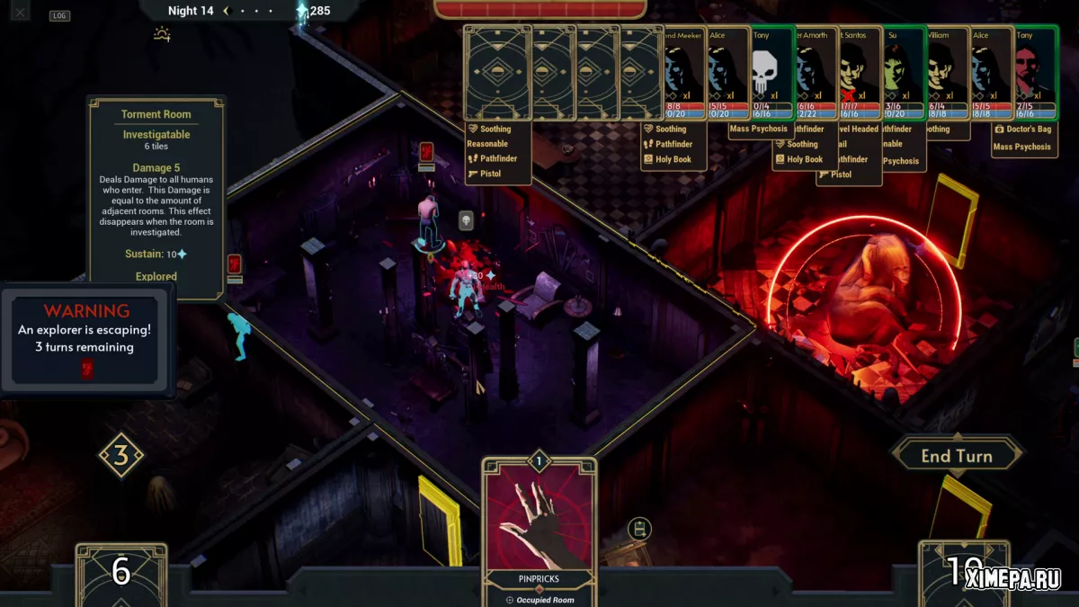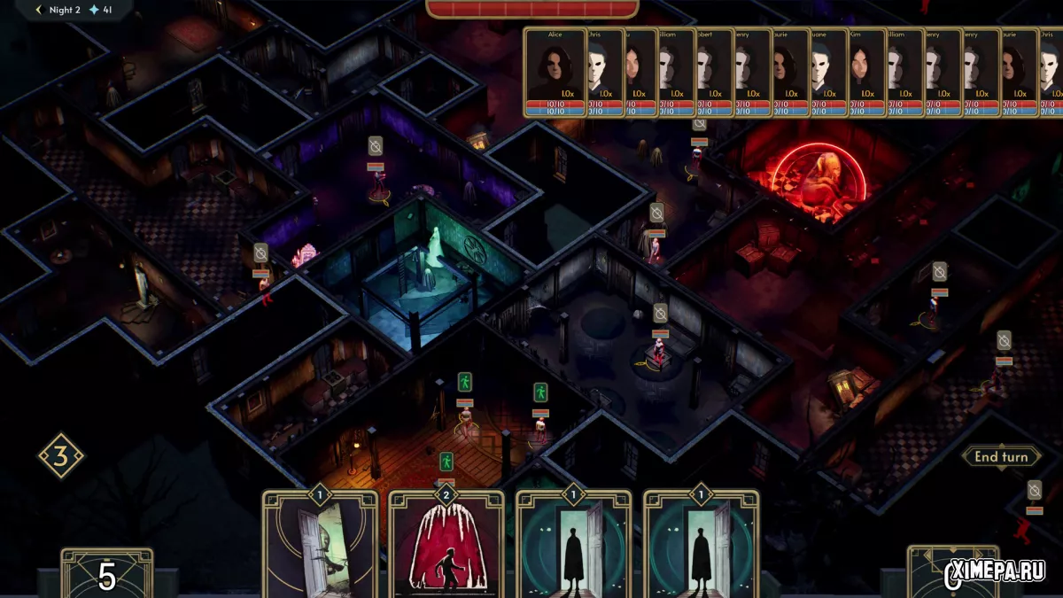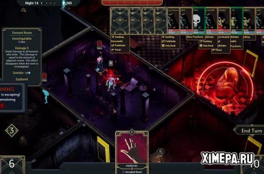 Карты в колоде не просто механики, а осмысленные элементы мира. Их эффекты логичны и легко читаются даже без долгих объяснений, особенно если игрок знаком с жанром ужасов. Например, некоторые способности работают только на одиноких персонажах, а их крики могут сводить с ума тех, кто находится поблизости. Благодаря этому игра остаётся интуитивной и не перегруженной искусственно усложнёнными правилами.