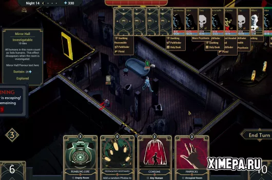 Между ночами игрок переходит в фазу строительства. За эссенцию, получаемую из поглощённых душ, можно расширять планировку особняка, добавляя новые комнаты. Чем больше дом, тем выше вероятность, что люди заблудятся в его коридорах и не дойдут до цели. Со временем обычные комнаты можно улучшать до особых, усиливающих урон или воздействие на рассудок, что добавляет глубины стратегическому планированию.