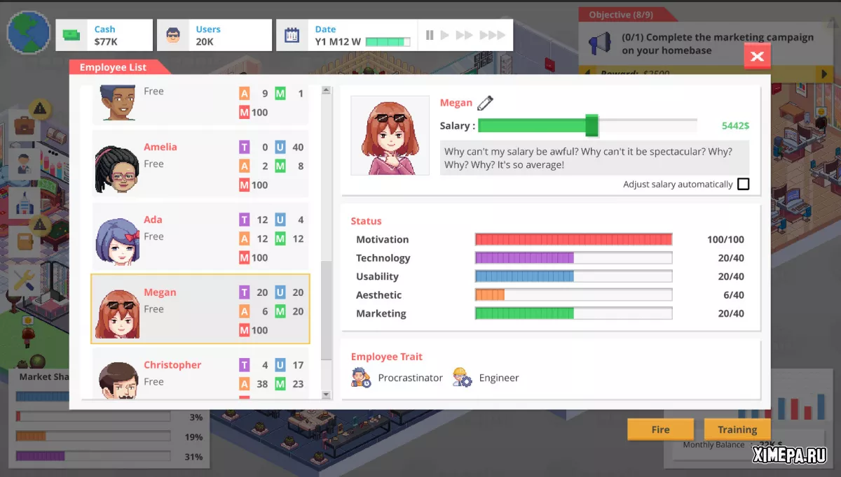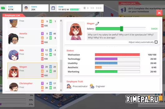 - Улучшайте свою компанию в древе навыков: возьмёте отпуск подольше или кондиционер подешевле?