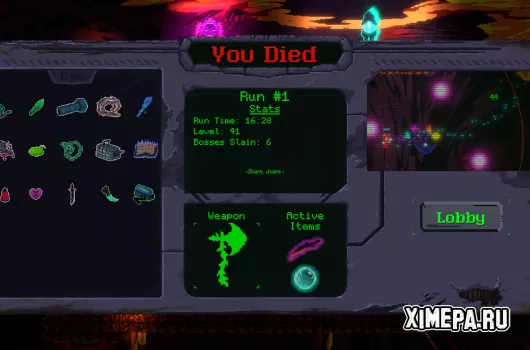 Бои с боссами — отдельная часть геймплейного ядра. Они редкие, запоминающиеся и сильно отличаются друг от друга. Некоторые боссы требуют изучения их поведения и слабых мест — классический "паттерн-бейст" подход. Другие превращают арену в шквал снарядов и требуют быстрой реакции, уворотов и точного расчёта. После победы над боссом вы можете выбрать одну из его уникальных способностей, тем самым усиливая персонажа и раскрывая новые варианты прохождения.