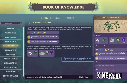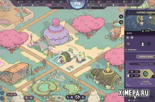 Мир живой и странный, вдохновлённый, кажется, мультфильмами вроде Nausicaä и стилем Moebius. Местные растения и ресурсы не просто собираются — их нужно изучать, тестировать и понимать, можно ли их есть, перерабатывать, возобновлять или использовать один раз и навсегда потерять. Производственные цепочки динамичны: меню кухни и ассортимент фабрик адаптируются к доступным ресурсам. Нужно что-то редкое? Выращивай сам. Экономика может быть устойчивой — если грамотно подходить к управлению.
