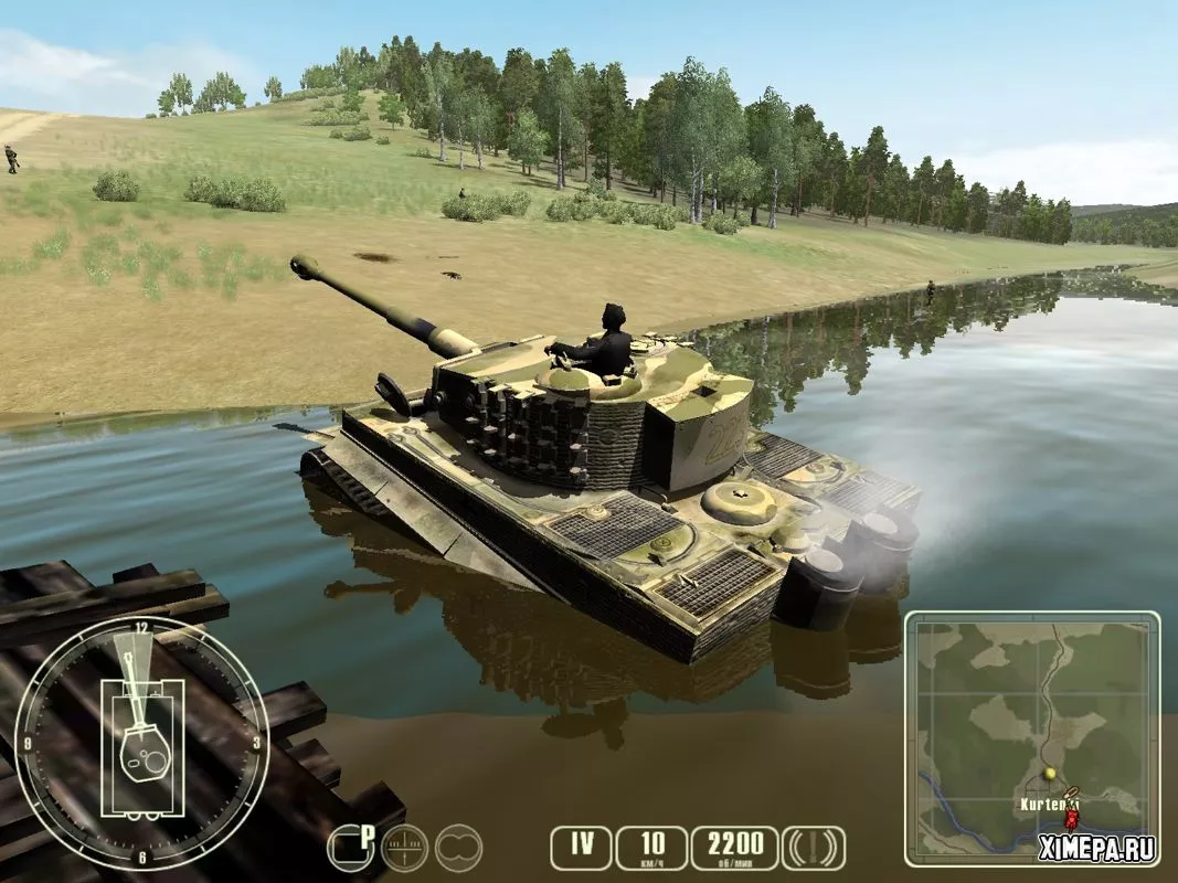 Графика для своего времени выглядит достойно, особенно в плане моделирования танков, хотя освещение порой кажется слишком жёстким. В игре нет полноценного взаимодействия с другими танками вашего подразделения: ИИ ограничен, союзники действуют хаотично и не поддаются управлению. Игровой процесс построен на строго заскриптованных миссиях, где игрок часто оказывается предоставлен самому себе — без приказов, без поддержки, без права на ошибку. В одной из таких миссий вы играете за немецкий Tiger, продвигаясь через деревню Куртенки к разрушенному мосту, стараясь уничтожить вражеские силы на противоположном берегу. План сдержанной разведки быстро рушится, когда ваш ИИ-союзник стремительно прорывается вперёд, не обращая внимания на тактическую обстановку.