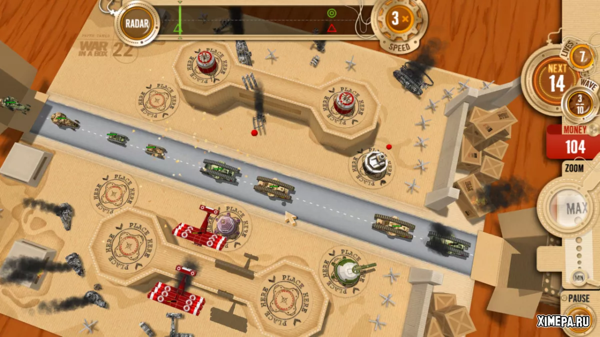 War in a Box: Paper Tanks — это классическая игра жанра tower defense, но с необычной визуальной подачей: весь мир, включая танки, самолёты, деревья и даже саму карту, выполнен из бумаги. Сражение разворачивается прямо в комнате, где бумажные враги вырываются из коробки и начинают наступление по извилистым тропам, стремясь добраться до цели. Задача игрока — остановить их, грамотно размещая и улучшая защитные башни.
